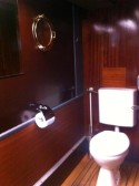 Toilettenabteil mit Porzellan-WC, Spiegel und Handwaschbecken. (1000 Liter Wassersystem)